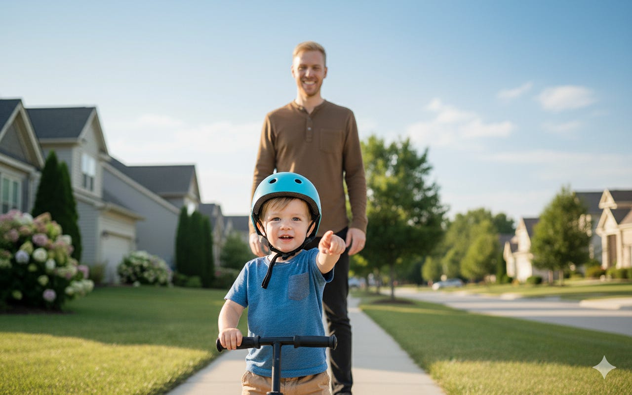 I spotted a father with his young son on one of those balance bikes—the kind where children scoot along with their feet, developing equilibrium before tackling the complexity of pedaling.